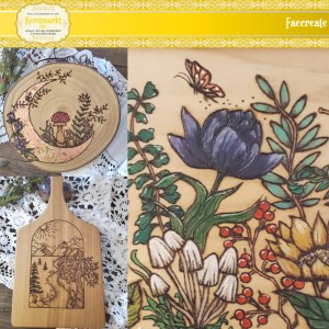Handmade pyrography creations on wooden kitchen utensils, bowls, cutting boards, wood slices, cork trivets and earrings.