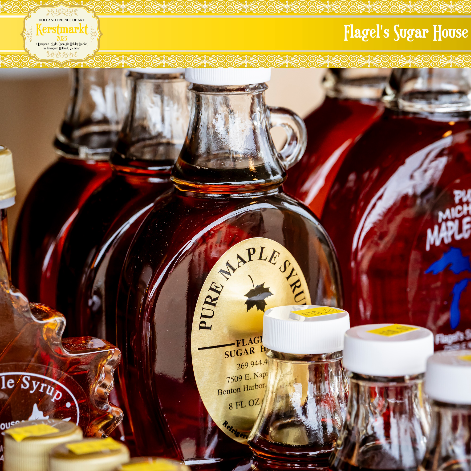 Maple syrup, sugar, candy and cream, pure honey, comb and honey sticks.