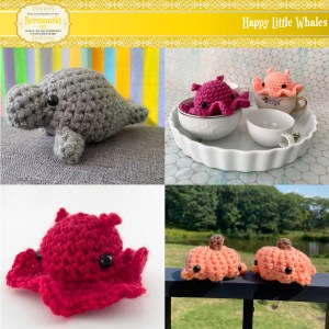 Handmade crochet amigurumi marine animals, catnip-filled crochet whale cat toys.