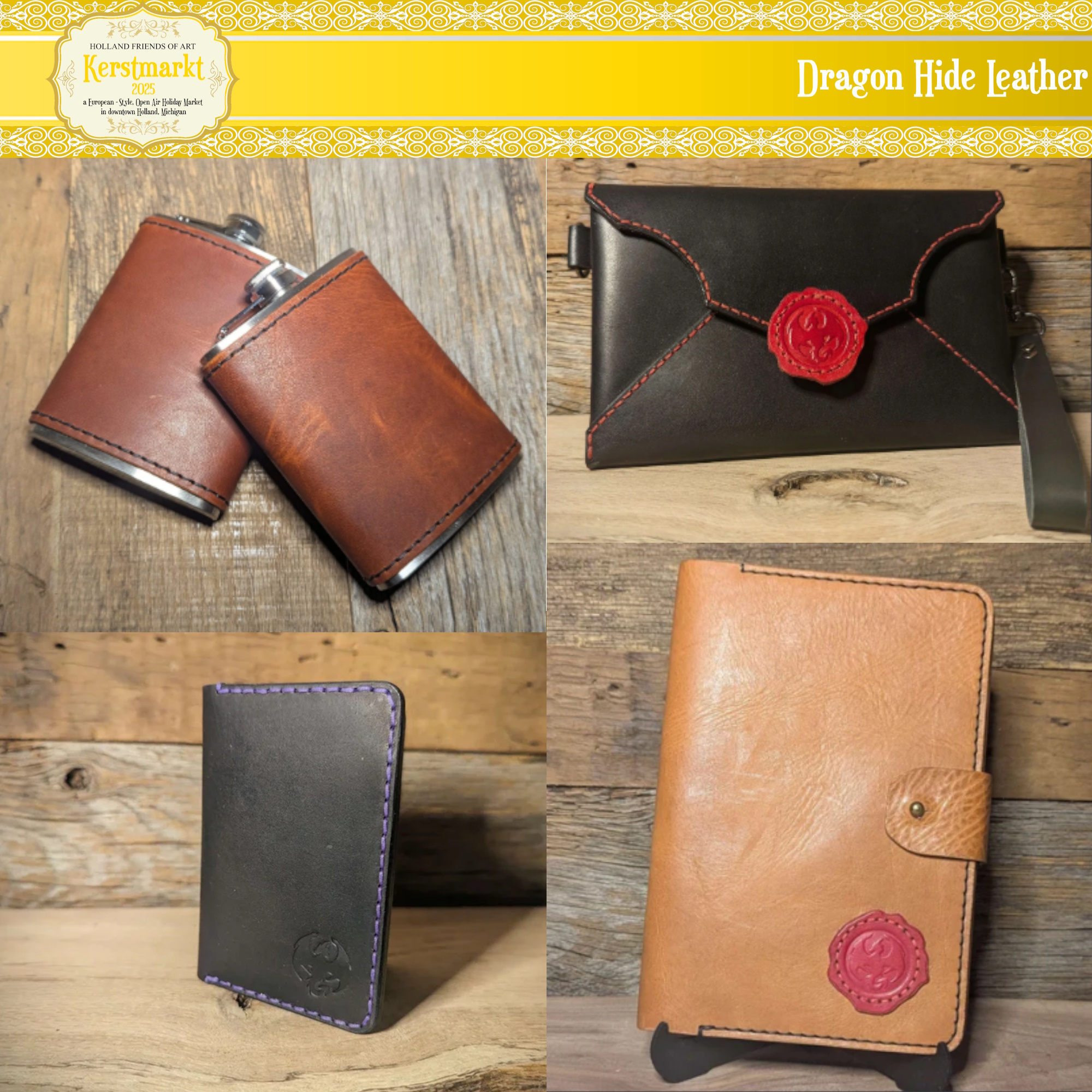 Handmade wood and leather ornaments and decor, advent calendars, stationery sets, creative “craft night” kits.