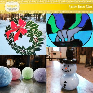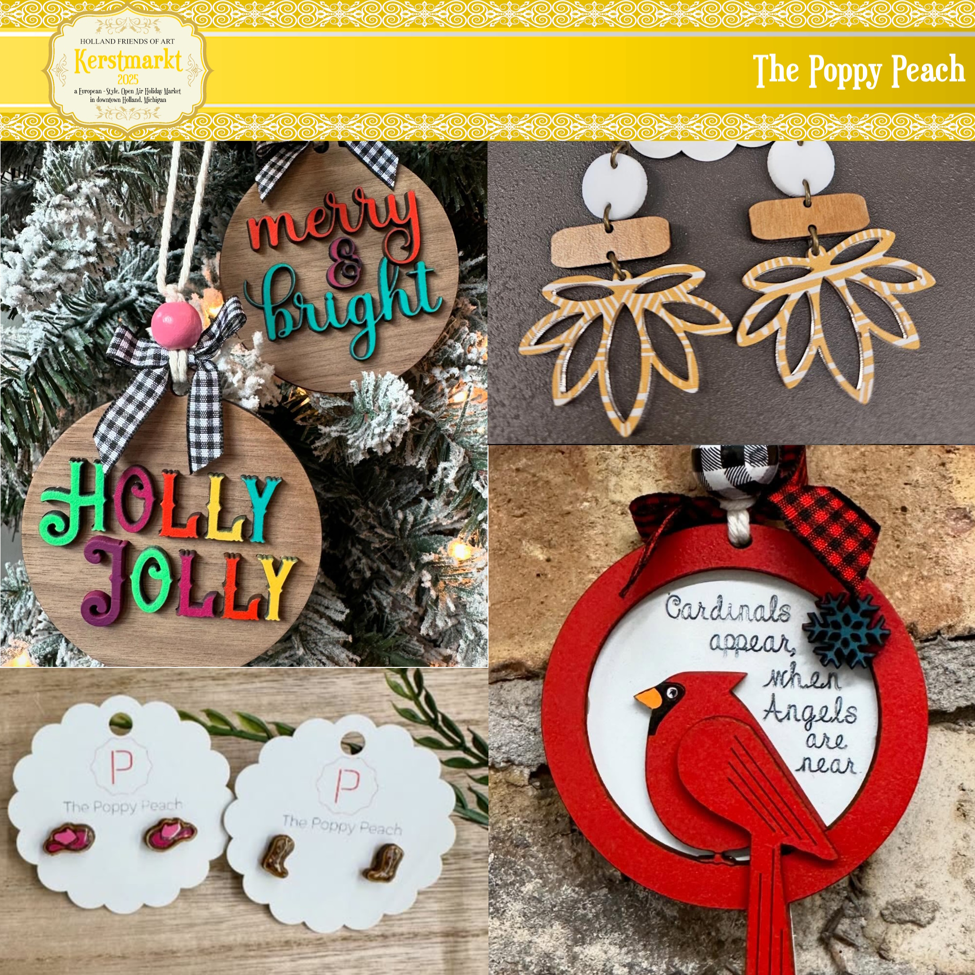 Handmade holiday ornaments (including personalized), holiday fidget toys, candy bowls, holiday earrings, and holiday signs and décor.