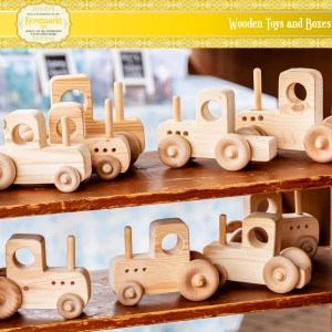 Handmade wooden vehicles, pull toys, boxes, and cutting charcuterie boards.