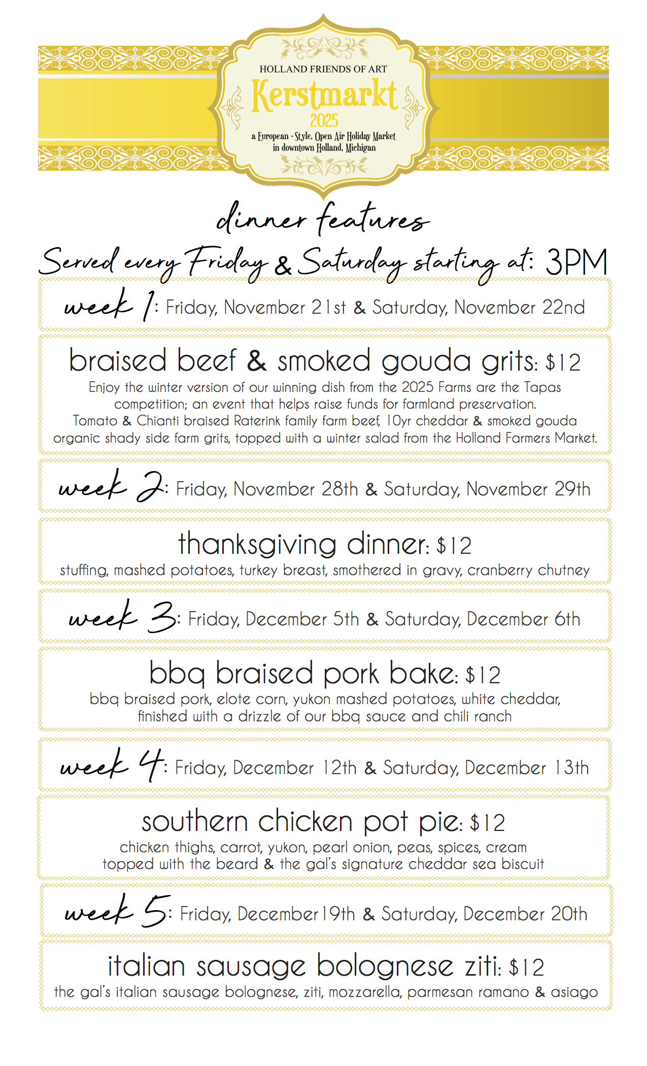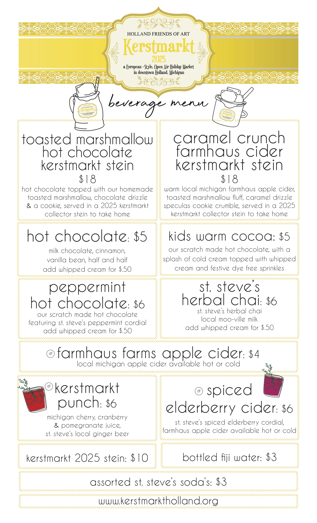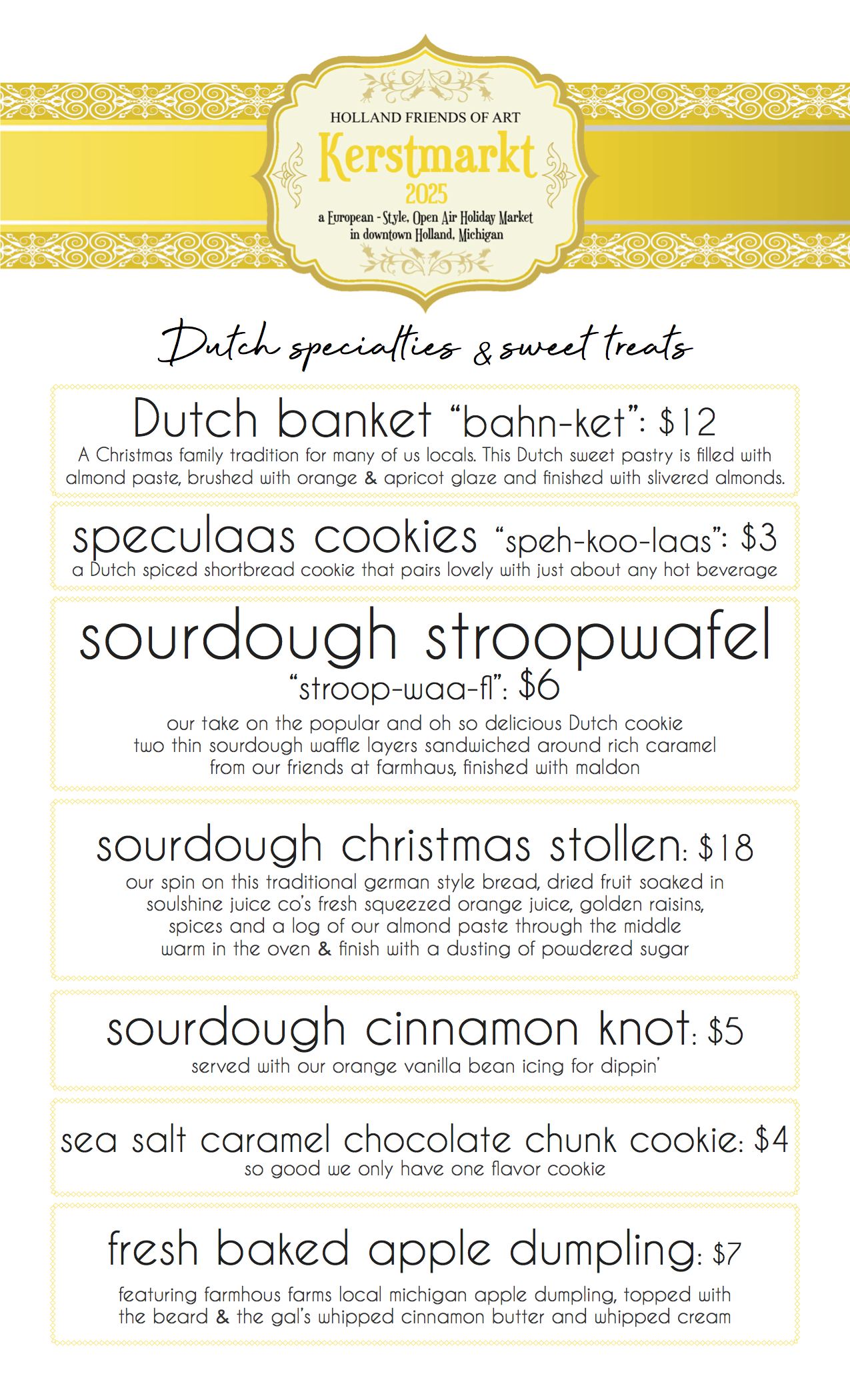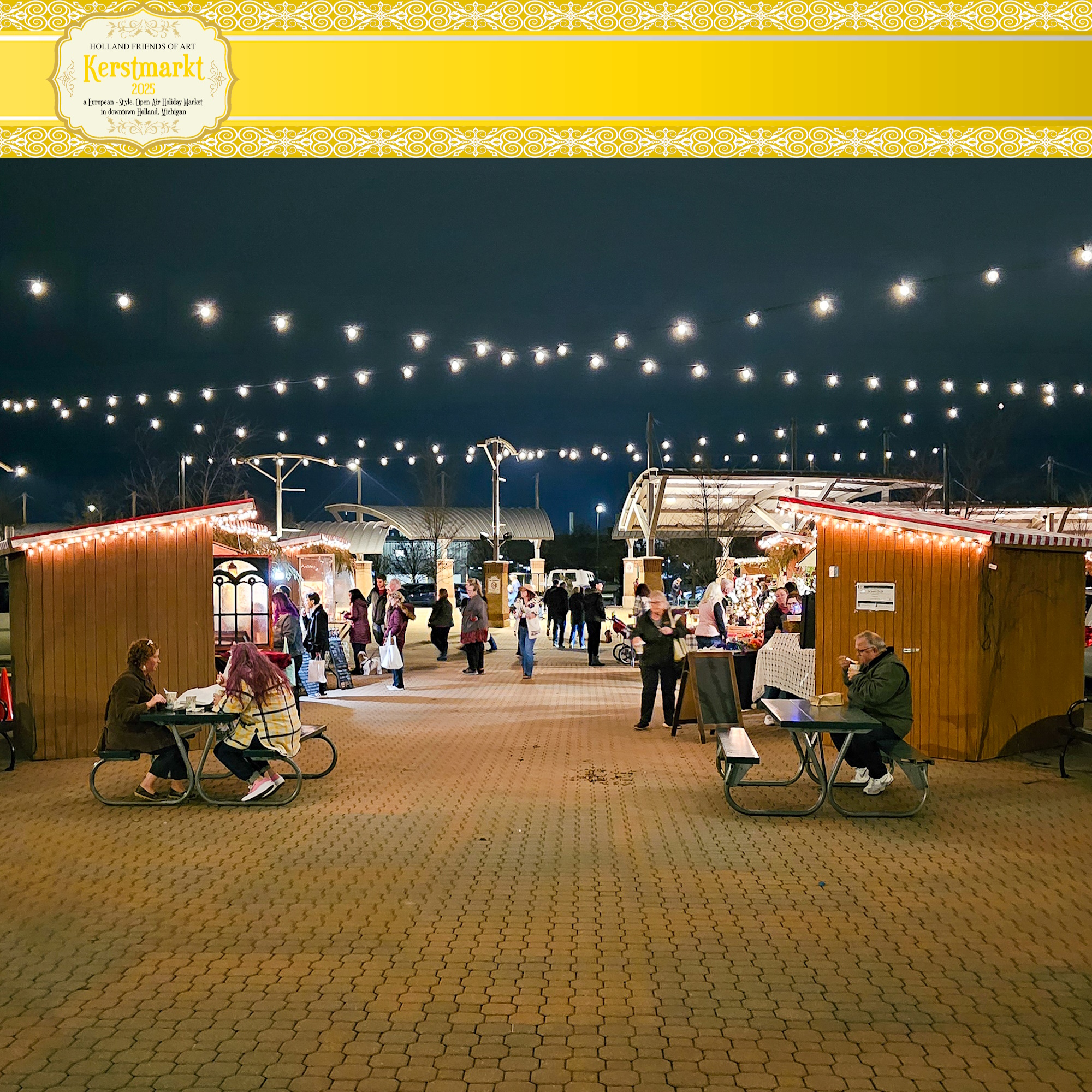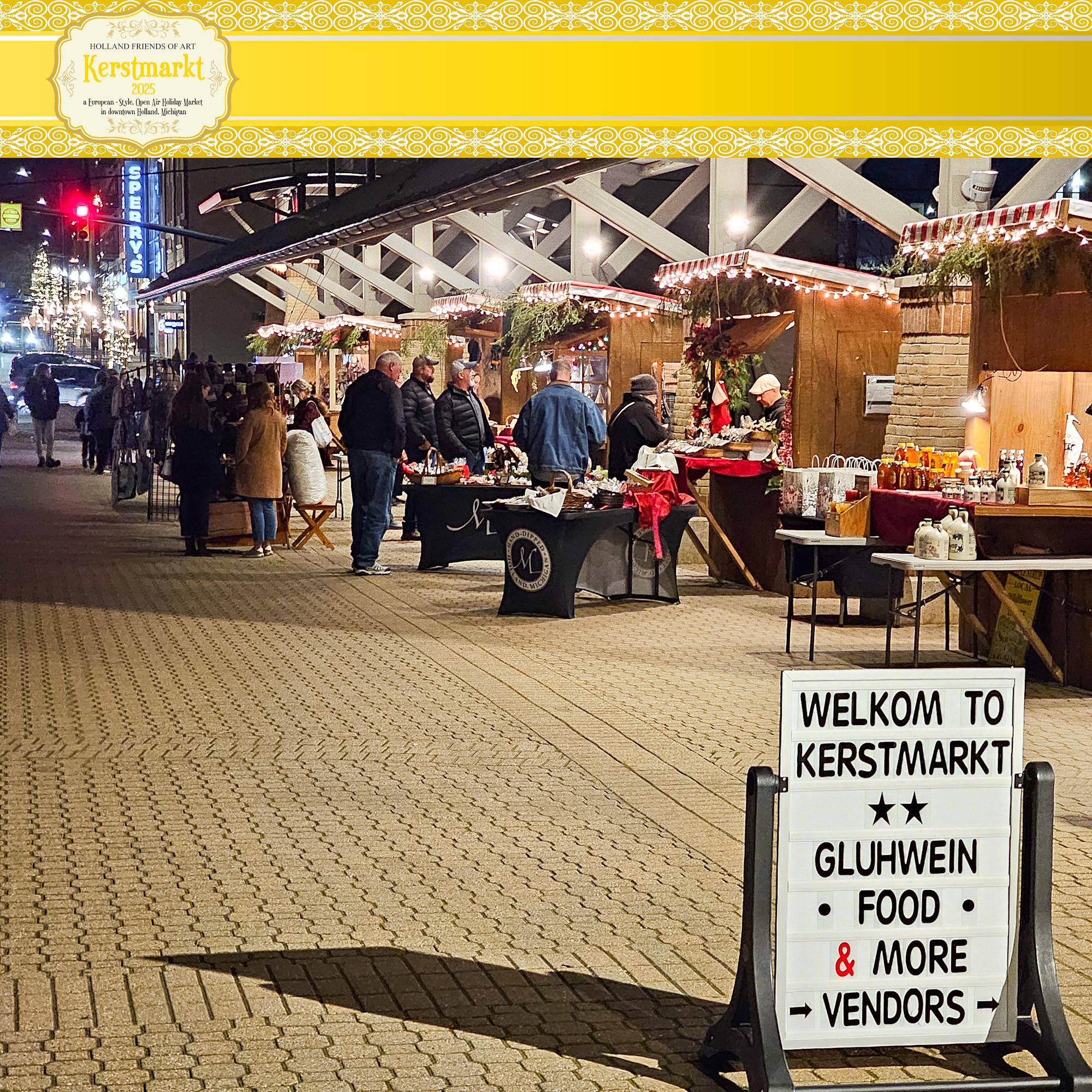 The Holland Friends of Art Kerstmarkt mission is to promote the Dutch Kerstmarkt tradition in Holland by providing a venue for local artisans and craft people. The Kerstmarkt is a nonprofit organization administered by an all-volunteer group.